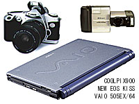 撮影用機材として今回私が用意したのは CANON NEW EOS KISS というとっても軽い一眼レフです。これには28mm〜80mmの純正レンズを付け、36枚撮りのフィルムを20本も用意しました。デジタルカメラでは、Nikon COOLPIX900 を用意しました。デジカメではフィルムの代わりに32MBのコンパクトフラッシュメモリを1枚と、単三型ニッケル水素充電池を8本(2セット分)と充電器を用意しました。それに撮った画像の保存用として、SONY VAIO 505EX/64 を持っていきました。また、これら電化製品を使うために電圧変換器とアダプターを持っていきました。PC等の精密機械を動かすため、変圧器には電流の整流機能を持つものを用意しました。電圧器の口はふつう1つですから二股ソケットも忘れずに用意します。このデジカメの場合、32MBのメモリーには、FINEモードで640×480ドットの画像が約200枚撮れます。本当はデジタルビデオも持っていきたかったんですが、かさばるし、撮るのが大変だし、後であまり見ないし・・・ということで、今回はやむを得ず置いていくことにしました。