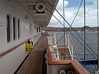 時間になったので、ボートでGE2へ戻るとすぐにランチでした。フロントには既に我々5日間組のバックが運ばれてきています。食後は部屋にいても何なので、プールデッキに出て外の風にあたっていましたが、時間になってもなかなかボートが出発する気配がありません。フロントで確認してみると、どうやら飛行機が遅れているようです。サエタ航空はサービスは良いのですが、遅れがちなのが玉に瑕ですね。結局ボートが出たのは16時半でした。